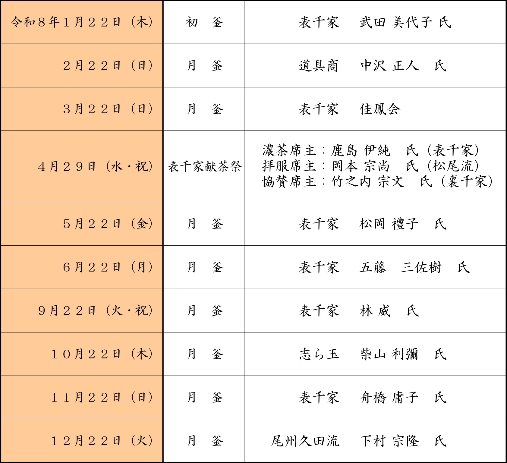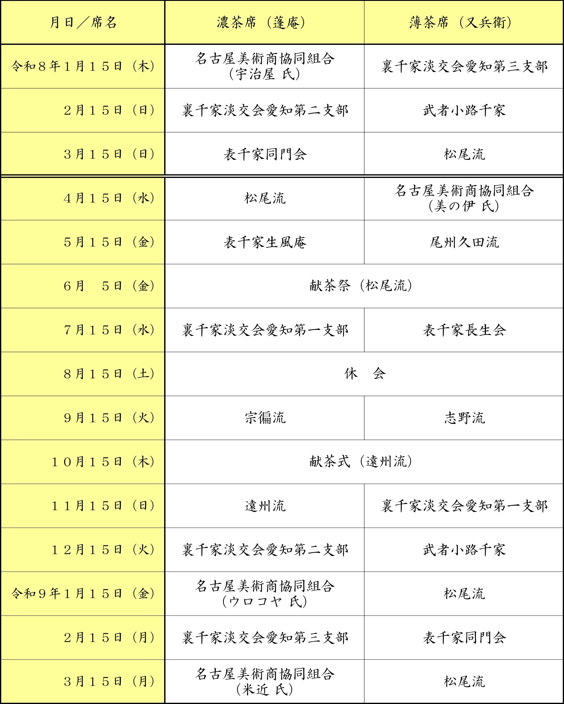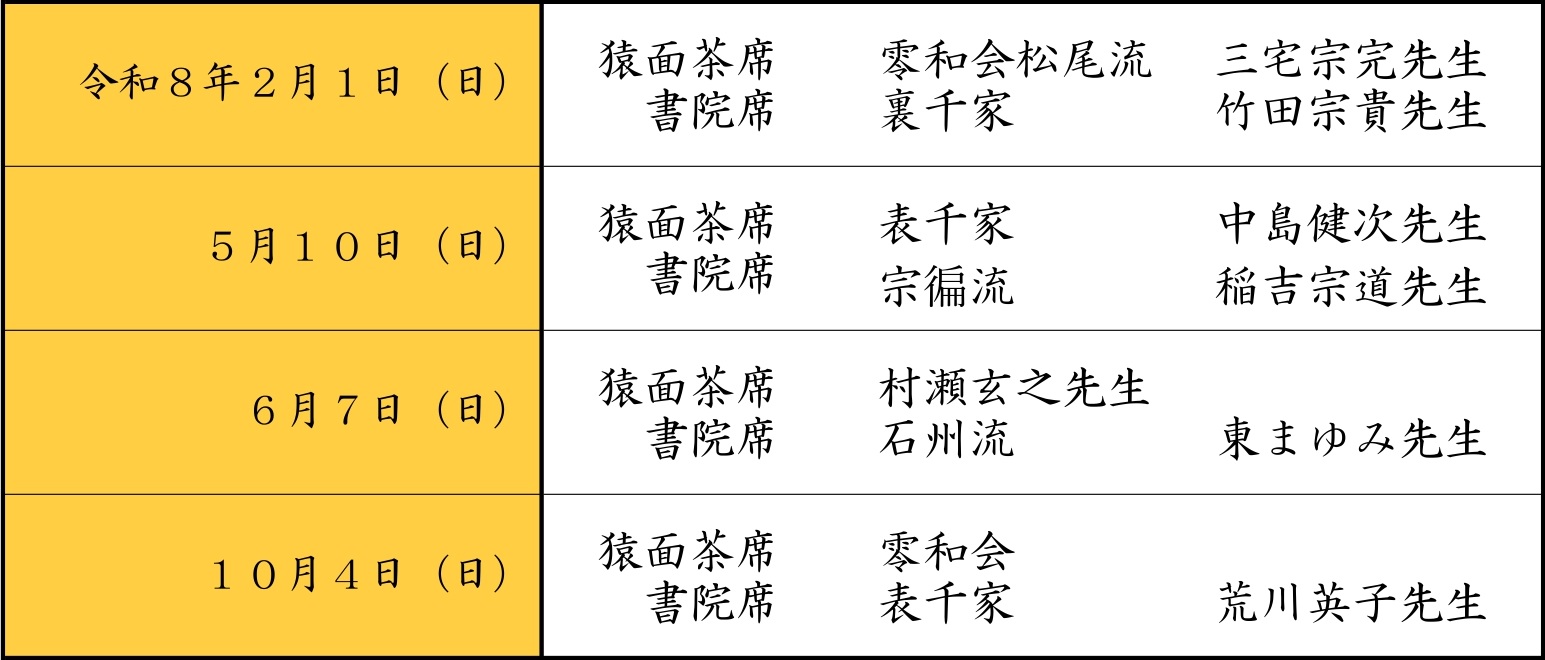 ・献茶祭齋行月、7月・8月の月釜は実施しない。