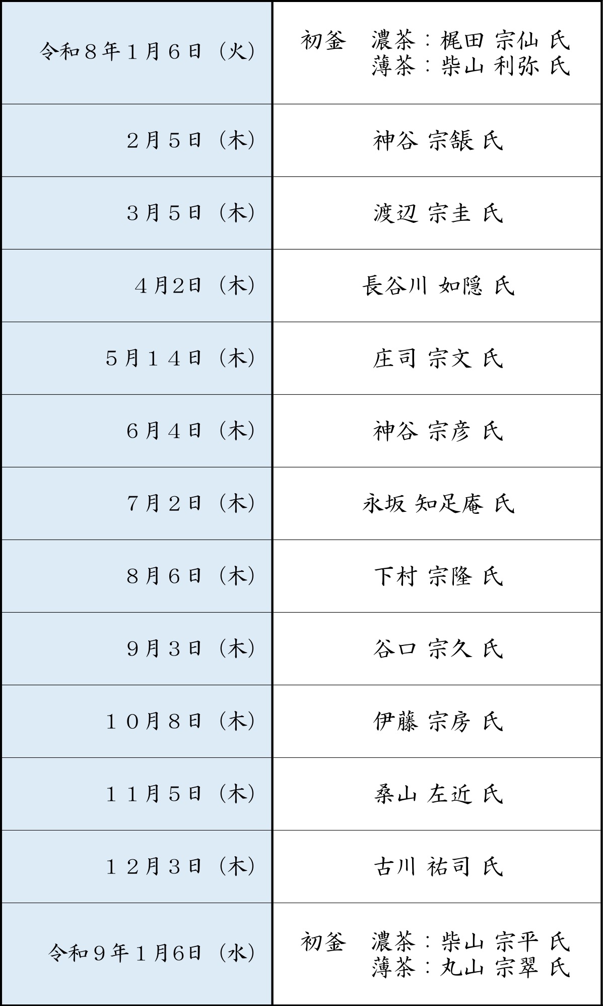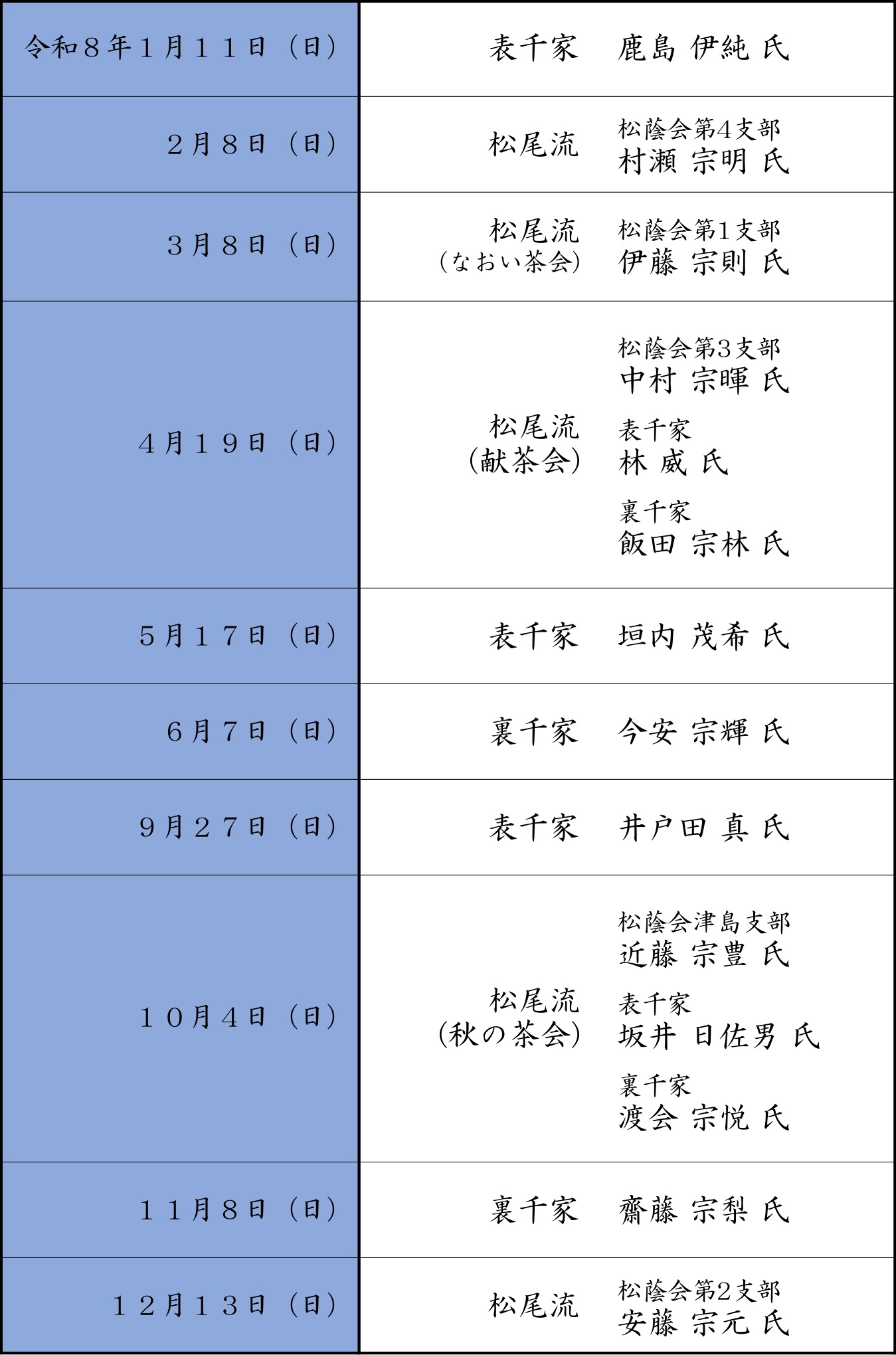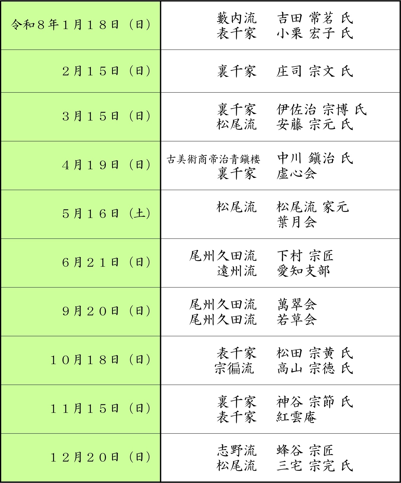 ・献茶祭齋行月、7月・8月の月釜は実施しない。